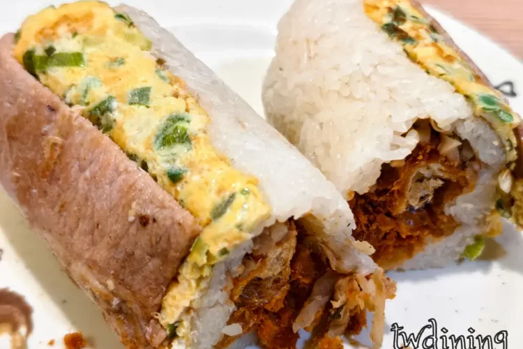 sliced sticky rice roll filled with crispy cruller and savory fried egg.