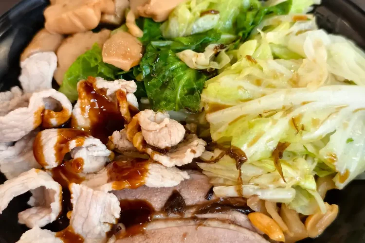 這是我最常點的品項。雙霸便當結合了店內兩大強項:嫩切鴨肉與Q彈松阪豬。松阪豬帶有一種獨特的焦香與爽脆口感,配上淋了鹹香滷汁的鴨肉,一次感受兩種層次的肉香對撞。便當裡的配菜也不馬虎,當季時蔬炒得翠綠且保有水分,不會有那種一般便當店隔夜菜的油膩感。