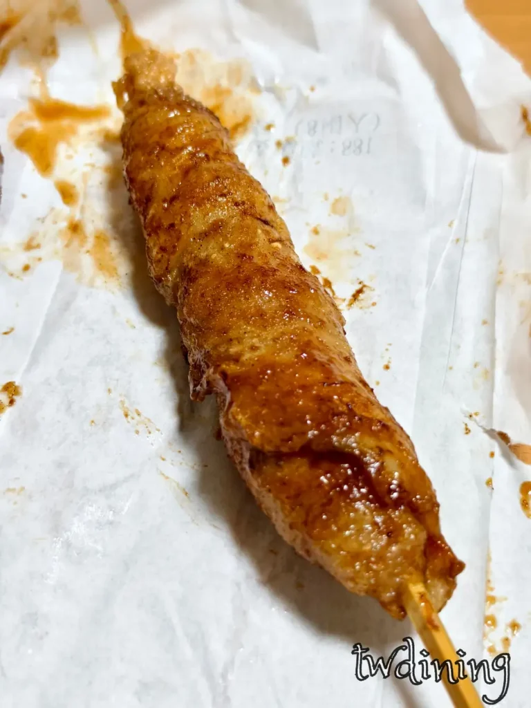 然而,相較於雞排與培根捲,這支 S 級牛肉串 就顯得有些差強人意。深褐色的牛肉塊串在木籤上,雖然醬燒味道依然入味,但可能因為「先炸後烤」的製程,牛肉在油炸過程中似乎縮水了不少,導致視覺上顯得有些瘦小,口感也變得稍微乾硬了一些,肉感不如想像中飽滿,這點稍微可惜了些。